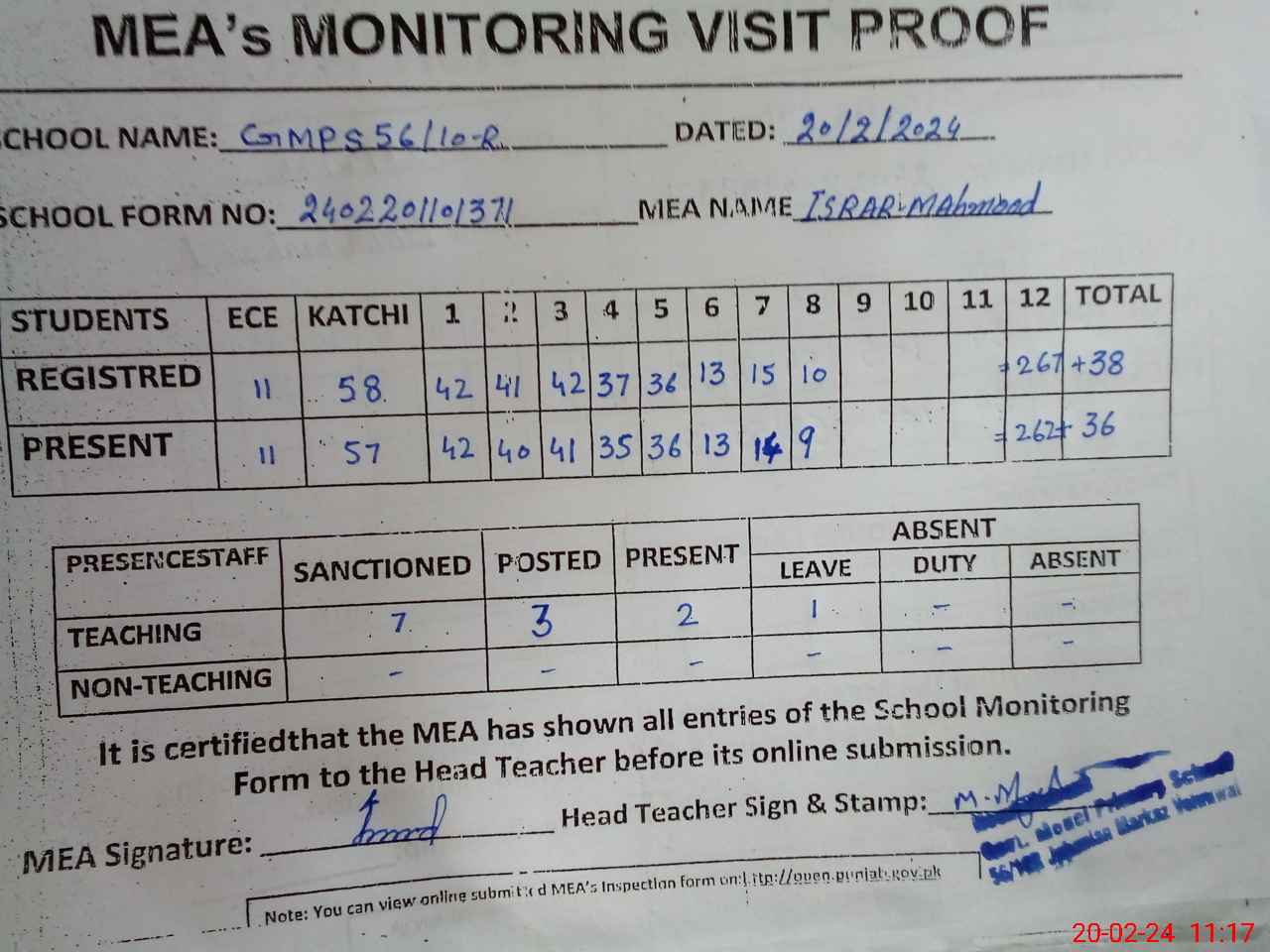 | Attendance Register | Head Teacher | MEA with School | Visit Proof |