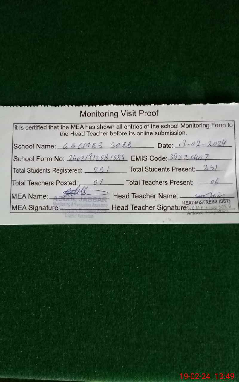 | Certified that this School was Inspected by the Undersigned MEA/DMO Today and the Information Stated Above is as Per Record. | |||||