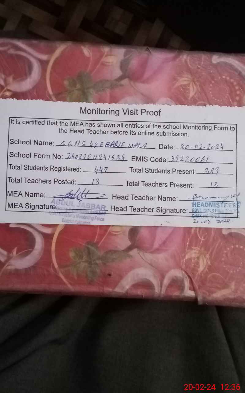 | EMIS Code: 39220061 | Name of School: GGHS 42 EB ARIFWALA | |||