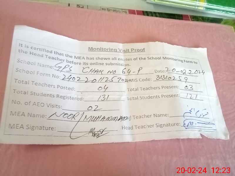 | EMIS Code: 31310259 | Name of School: GPS CHAK NO 64 P | |||