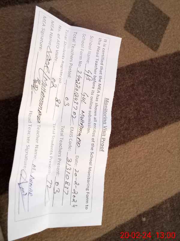 | Attendance Register | Head Teacher | MEA with School | Visit Proof |