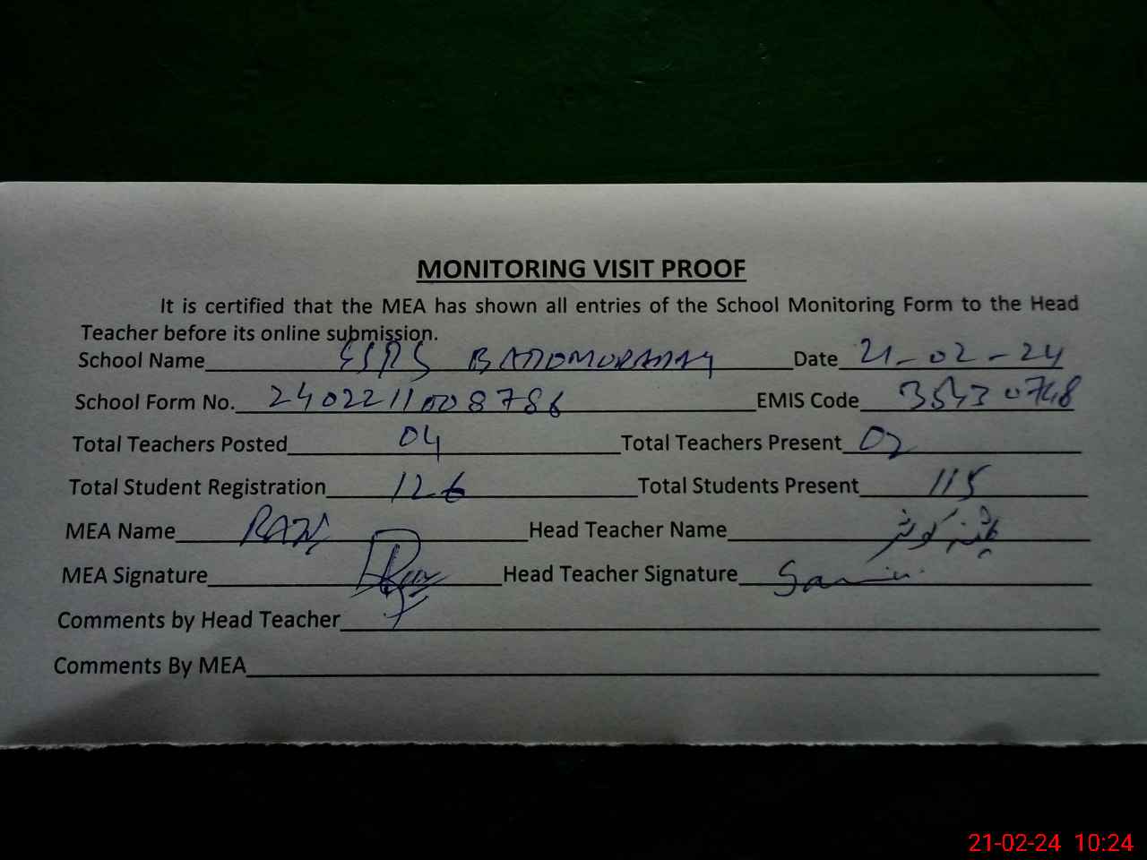 | Attendance Register | Head Teacher | MEA with School | Visit Proof |