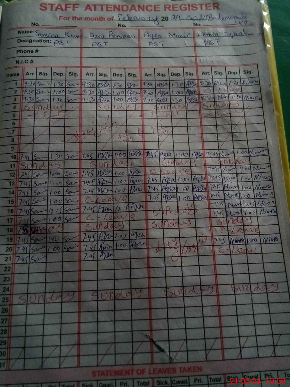 | CNIC | Full Name | Designation | R/C | Absence During Last Calender Month |