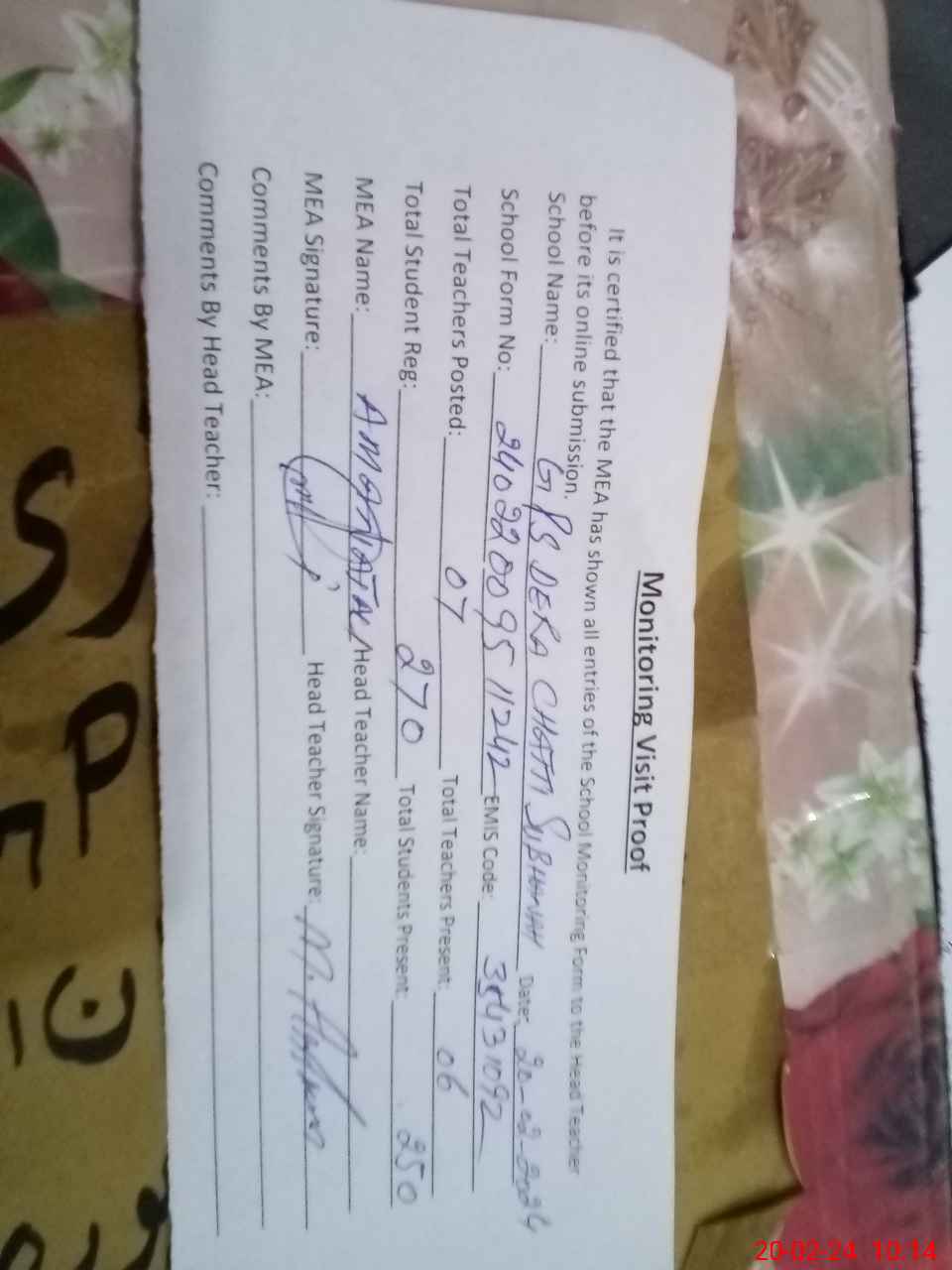 | Attendance Register | Head Teacher | MEA with School | Visit Proof |