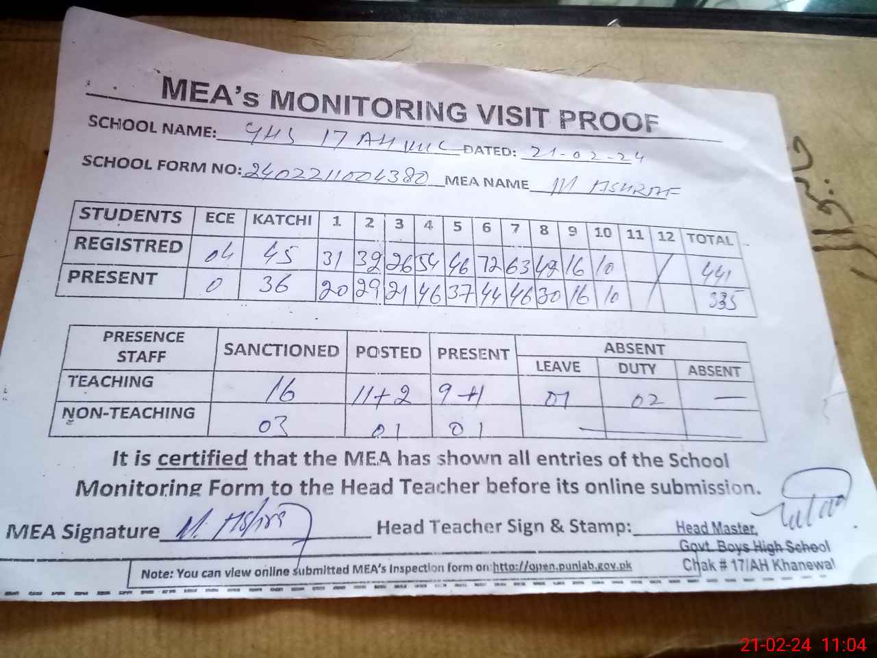 | EMIS Code: 36420067 | Name of School: GHS 17/AH, KHANEWAL | |||