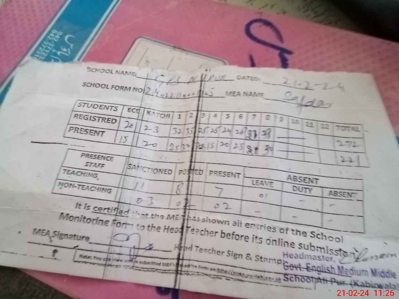 | Attendance Register | Head Teacher | MEA with School | Visit Proof |