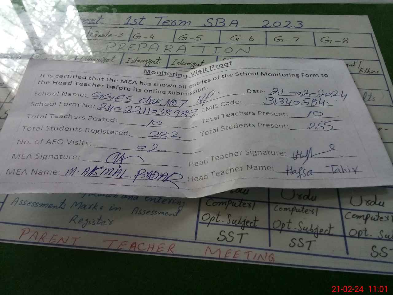 | Attendance Register | Head Teacher | MEA with School | Visit Proof |