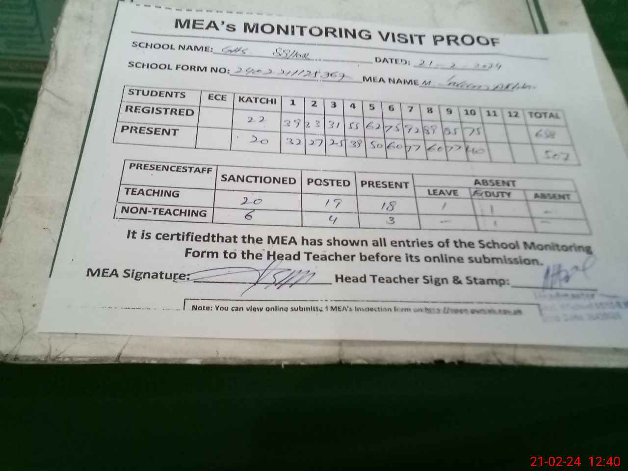 | Attendance Register | Head Teacher | MEA with School | Visit Proof |