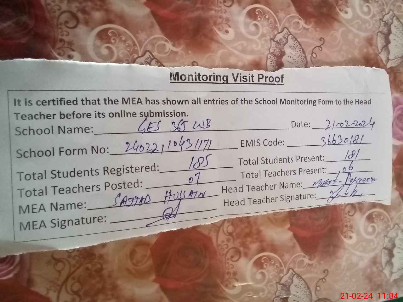 | Attendance Register | Head Teacher | MEA with School | Visit Proof |