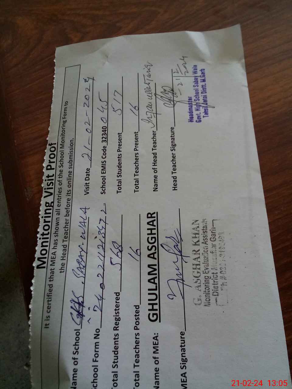 | EMIS Code: 32340045 | Name of School: GHS SABAY WALA | |||