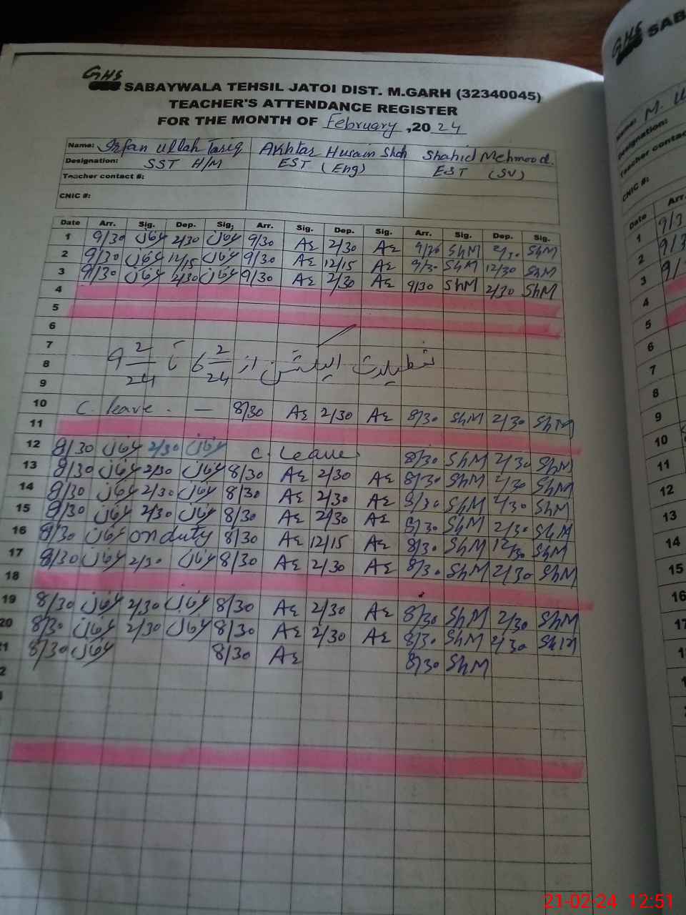 | Name: IR**** UL**** TA**** Designation: (School Headmaster's/Headmistress's) S.S.T.(GEN) Phone/Cell Number: 03**** |