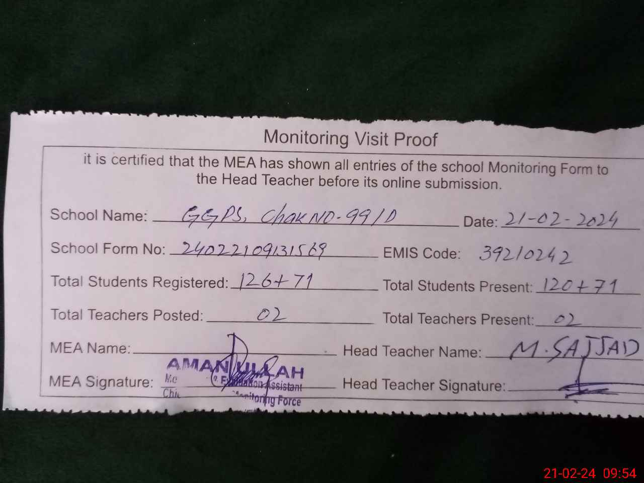 | Attendance Register | Head Teacher | MEA with School | Visit Proof |