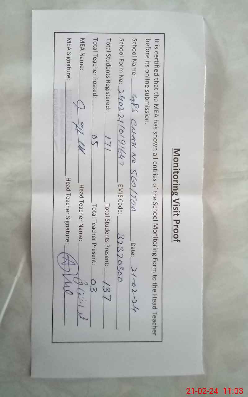 | Attendance Register | Head Teacher | MEA with School | Visit Proof |