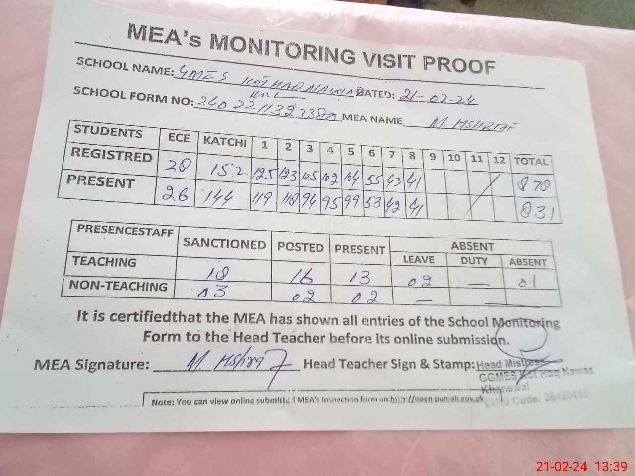 | EMIS Code: 36420418 | Name of School: GGMES KOT HAQ NAWAZ, OLD KHANEWAL | |||