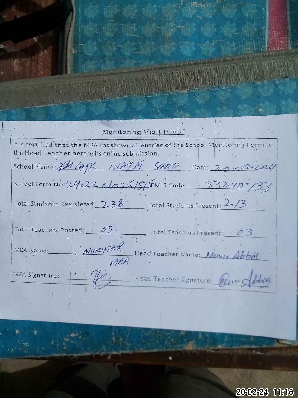| EMIS Code: 33240733 | Name of School: GPS INAYAT SHAH | |||