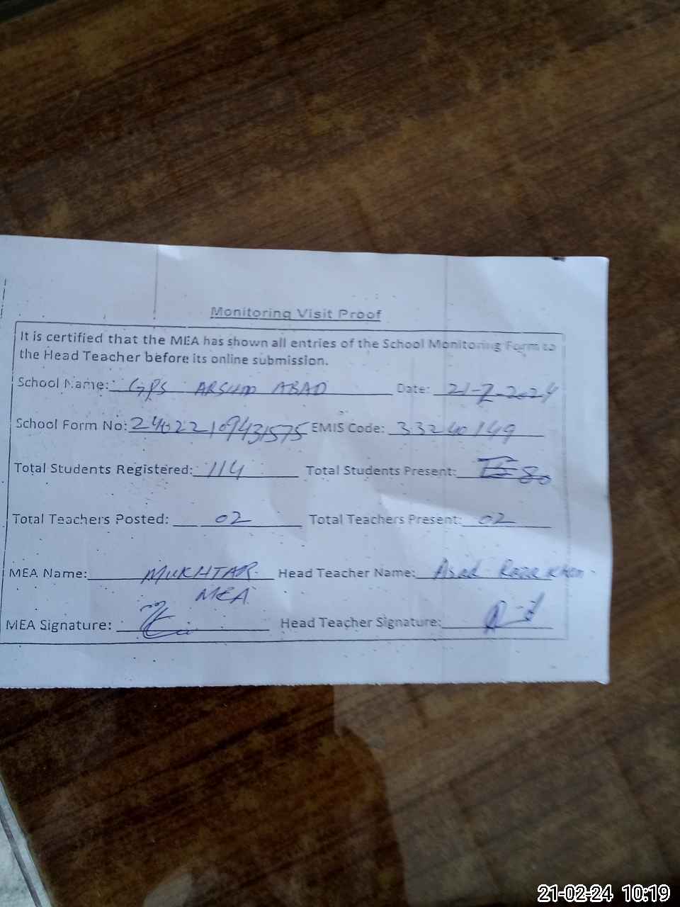 | Attendance Register | Head Teacher | MEA with School | Visit Proof |