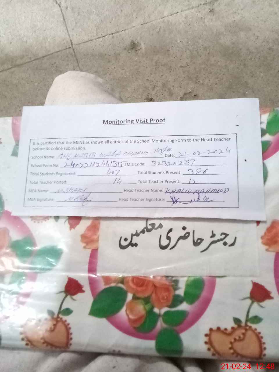 | EMIS Code: 32320237 | Name of School: GHS HABIB WALA (CHAK NO. 145/ML) | |||