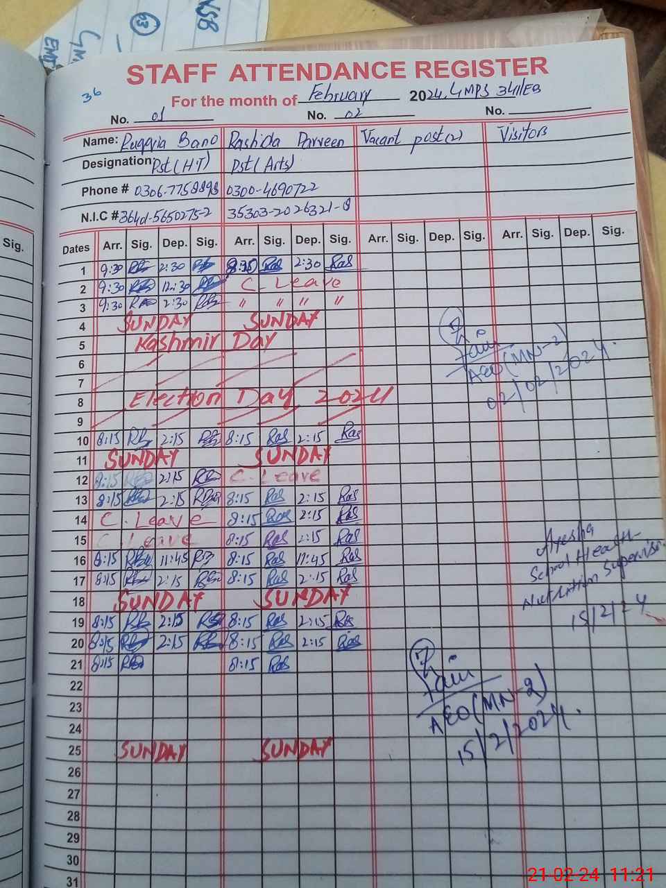 | CNIC | Full Name | Designation | R/C | Absence During Last Calender Month |