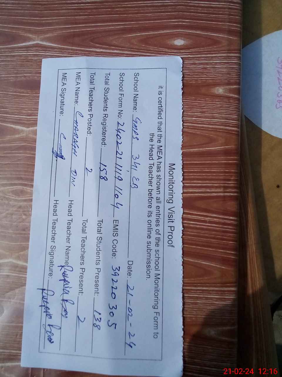 | Attendance Register | Head Teacher | MEA with School | Visit Proof |