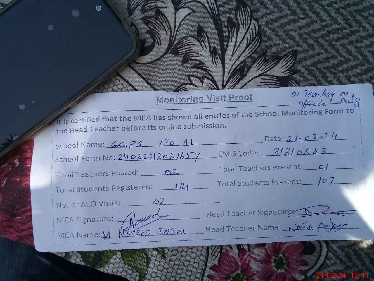 | Attendance Register | Head Teacher | MEA with School | Visit Proof |