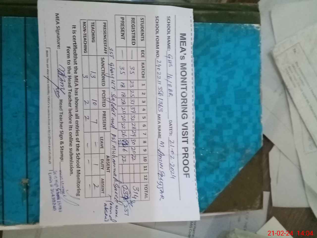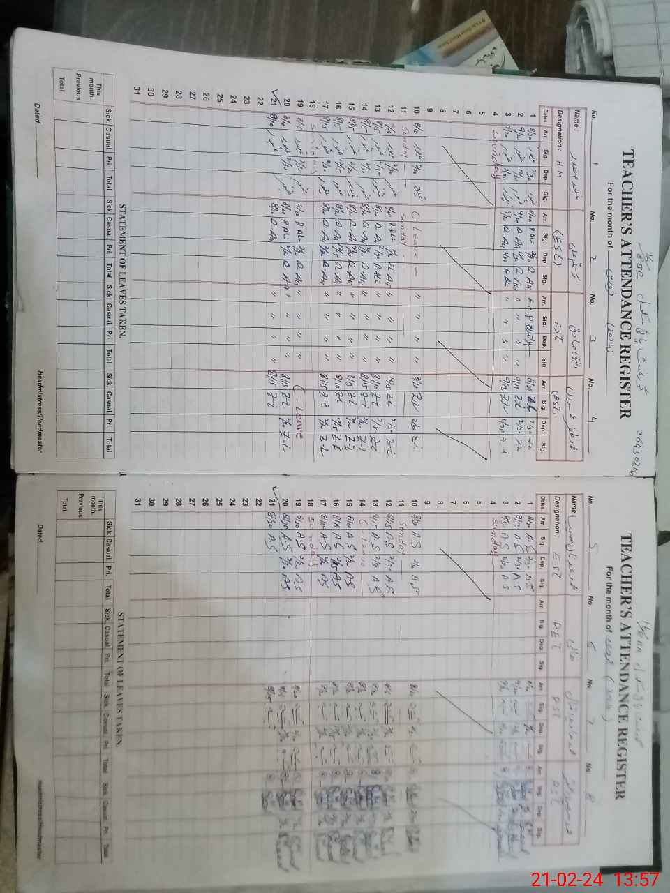 | Remarks (Use Separate Page if Required): NSB record register not updated for the month January 2024 SST Ghayur safdar and PST Muhammad Saeed were found absent today during visit the school | |||||