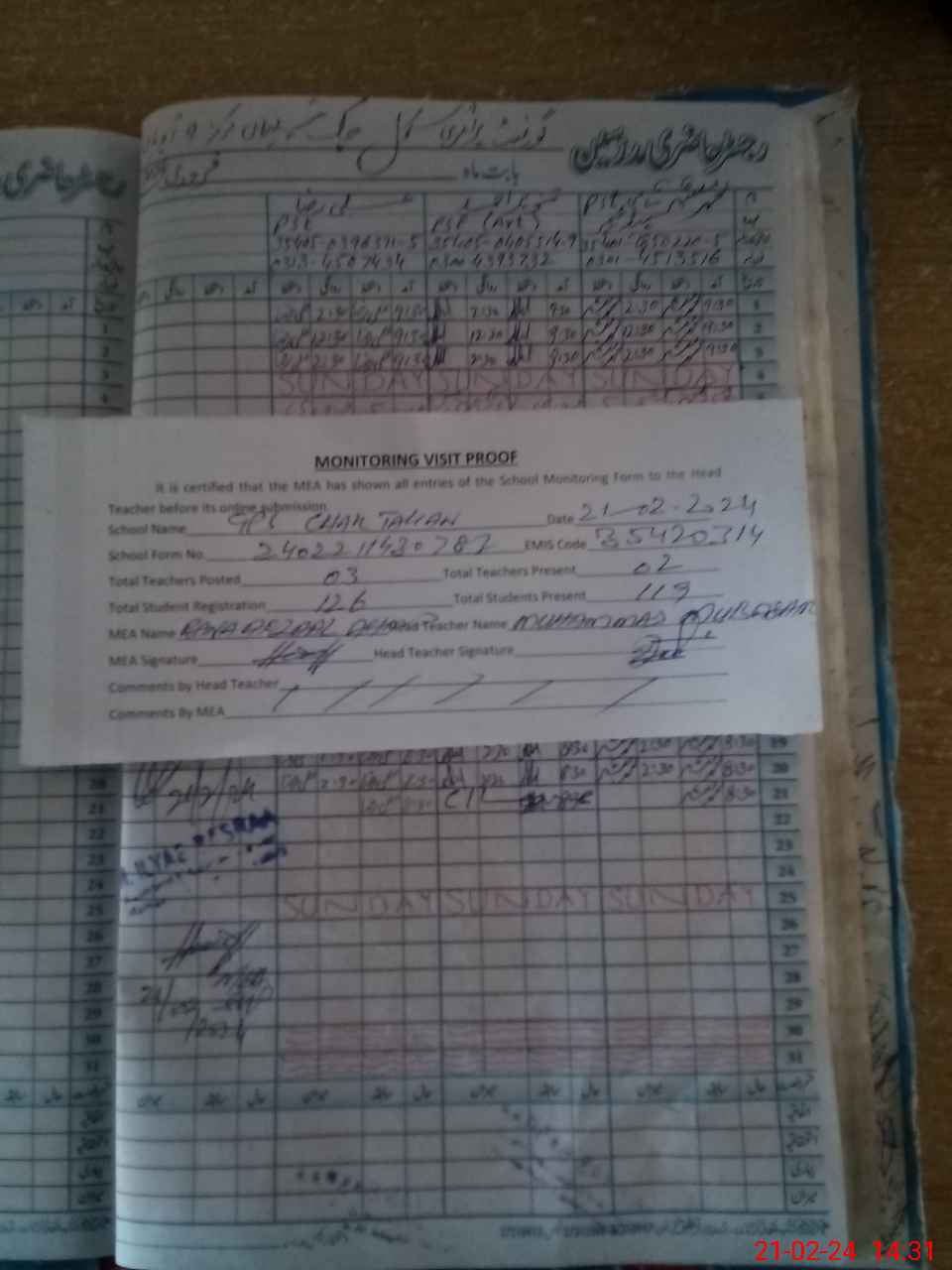 | Attendance Register | Head Teacher | MEA with School | Visit Proof |