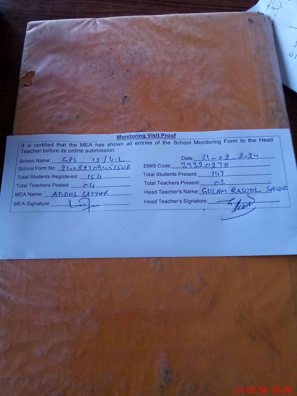 | Attendance Register | Head Teacher | MEA with School | Visit Proof |