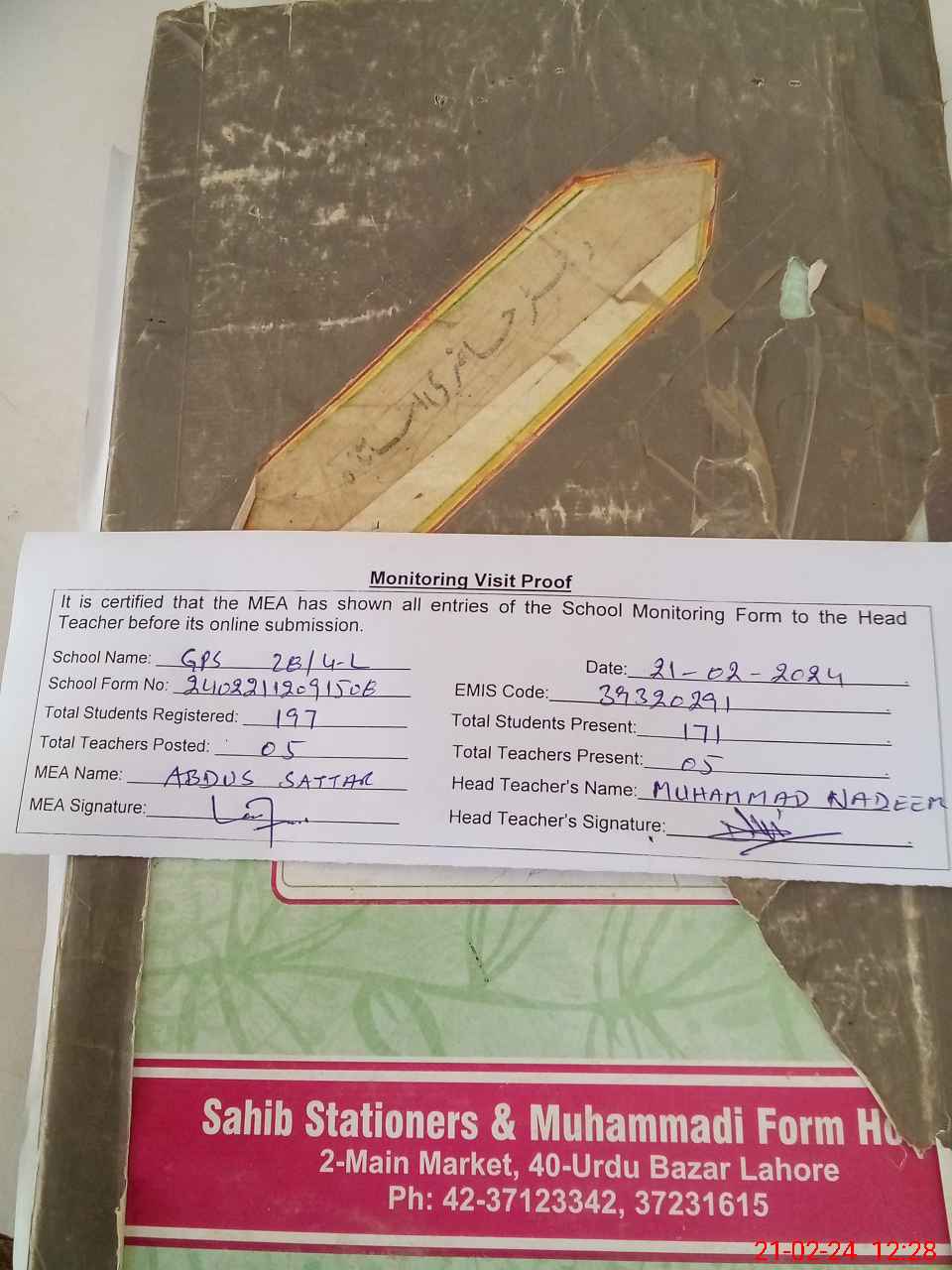 | Attendance Register | Head Teacher | MEA with School | Visit Proof |