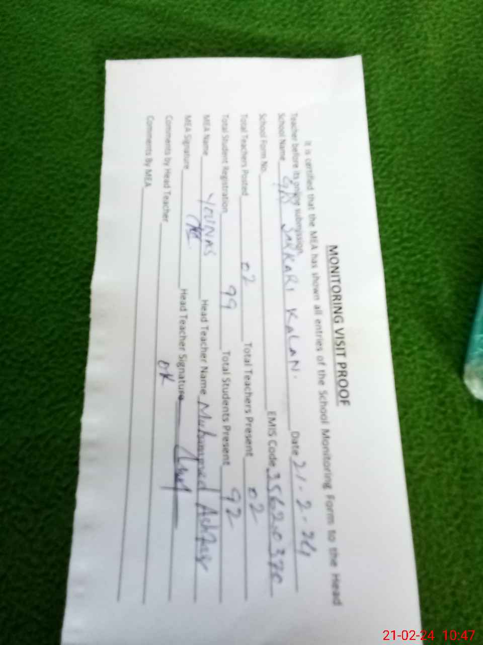 | Attendance Register | Head Teacher | MEA with School | Visit Proof |