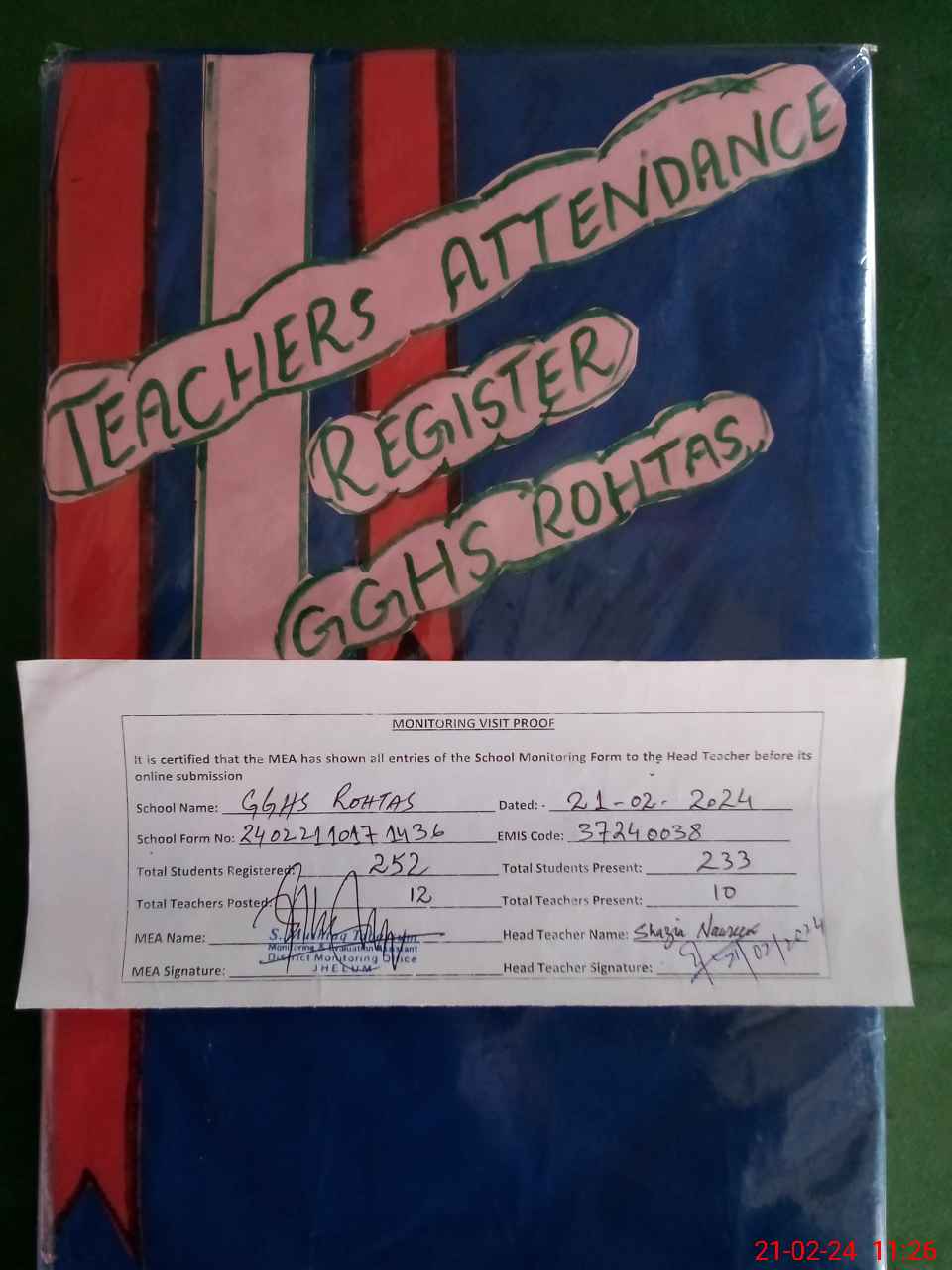 | Attendance Register | Head Teacher | MEA with School | Visit Proof |