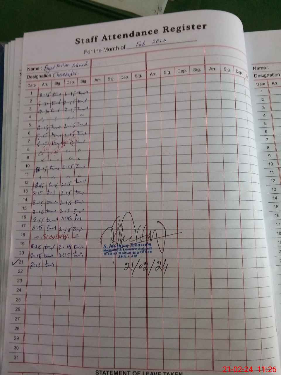 | CNIC | Full Name | Designation | R/C | Absence During Last Calender Month |