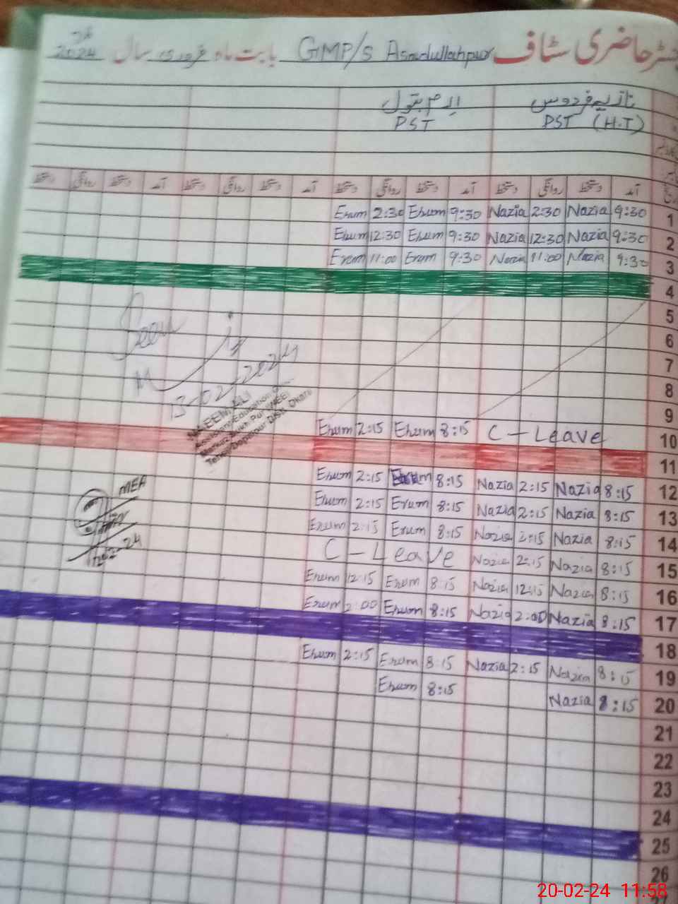 | CNIC | Full Name | Designation | R/C | Absence During Last Calender Month |