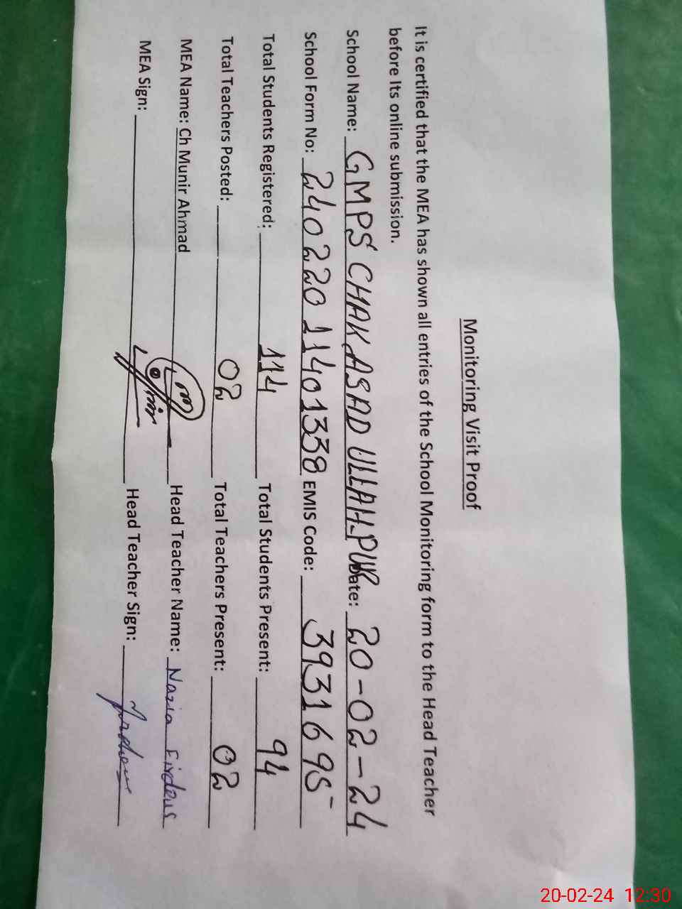 | Attendance Register | Head Teacher | MEA with School | Visit Proof |