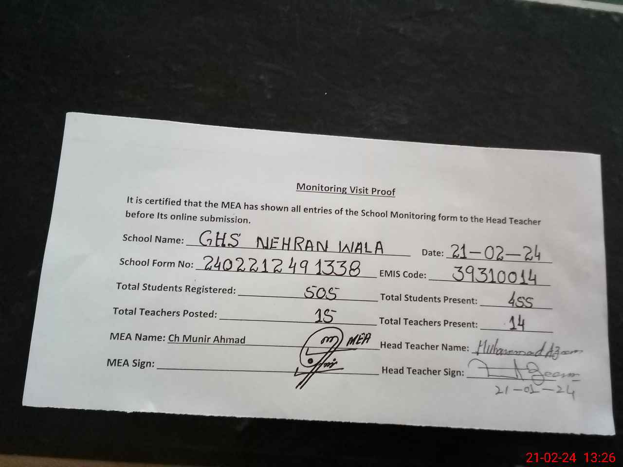 | EMIS Code: 39310014 | Name of School: GHS NEHRANWALA | |||