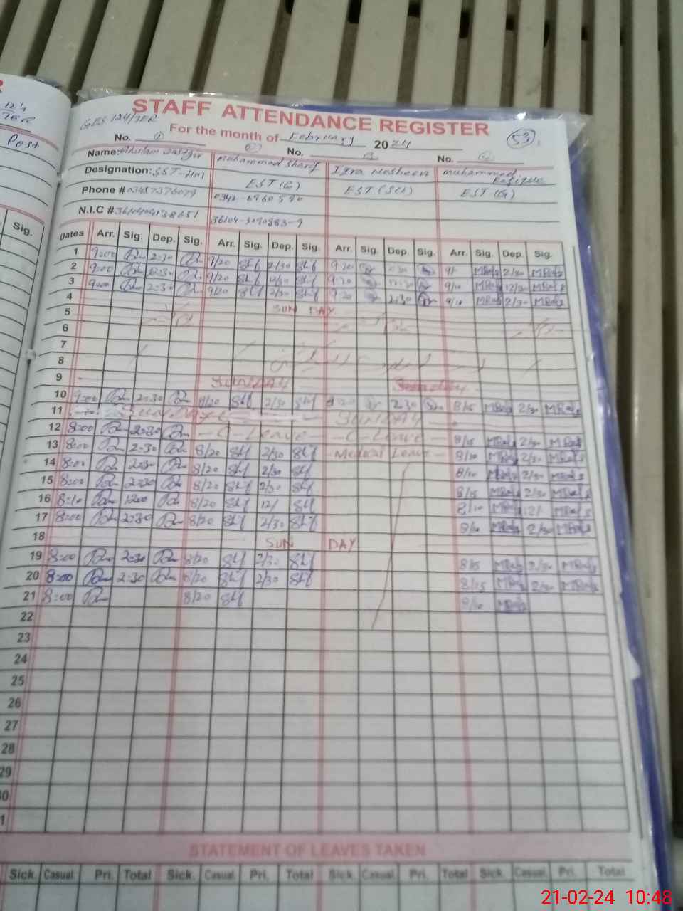 | CNIC | Full Name | Designation | R/C | Absence During Last Calender Month |
