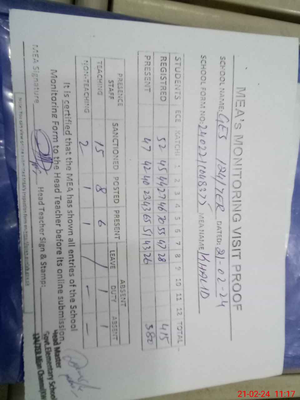 | Attendance Register | Head Teacher | MEA with School | Visit Proof |