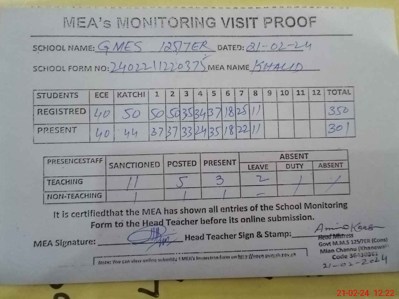 | Attendance Register | Head Teacher | MEA with School | Visit Proof |