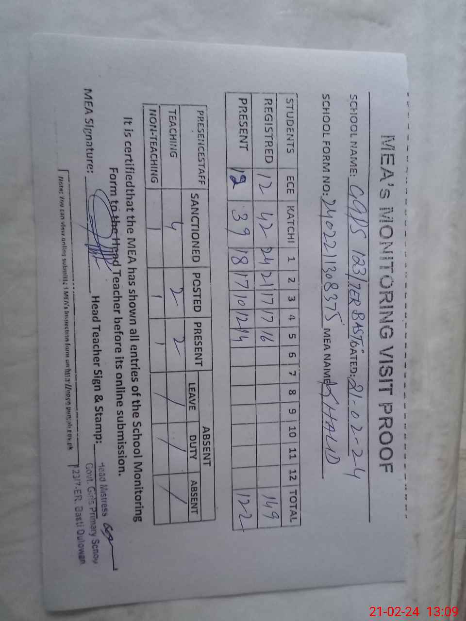 | Attendance Register | Head Teacher | MEA with School | Visit Proof |