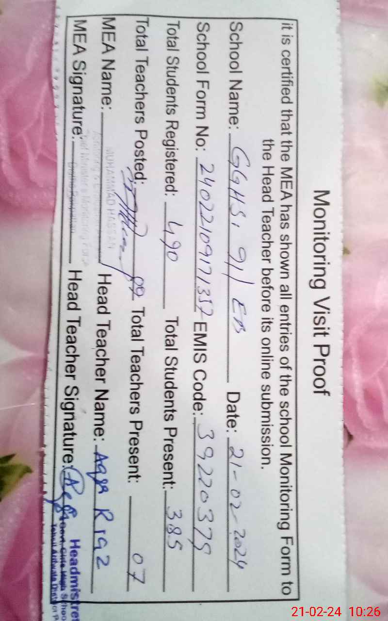 | EMIS Code: 39220379 | Name of School: GGHS 91 EB MOHALAN WALA | |||