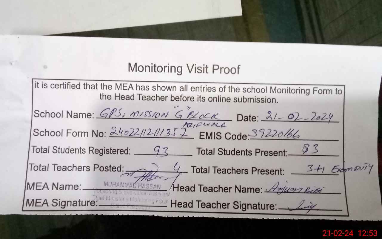 | EMIS Code: 39220166 | Name of School: GPS MISSION BLOCK G | |||