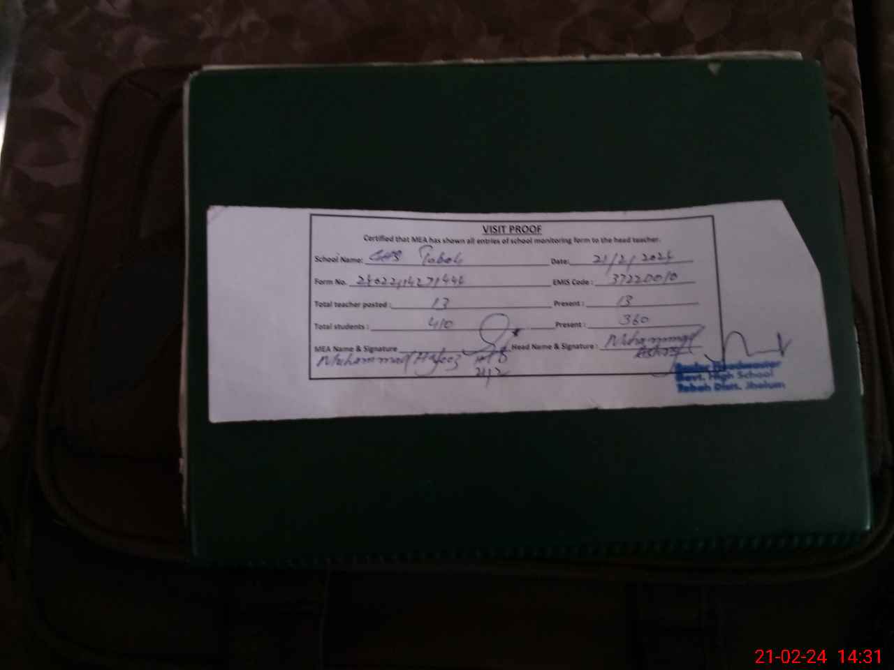 | Attendance Register | Head Teacher | MEA with School | Visit Proof |