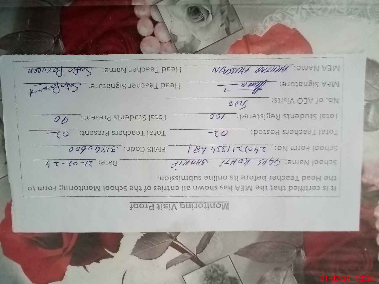 | Certified that this School was Inspected by the Undersigned MEA/DMO Today and the Information Stated Above is as Per Record. | |||||