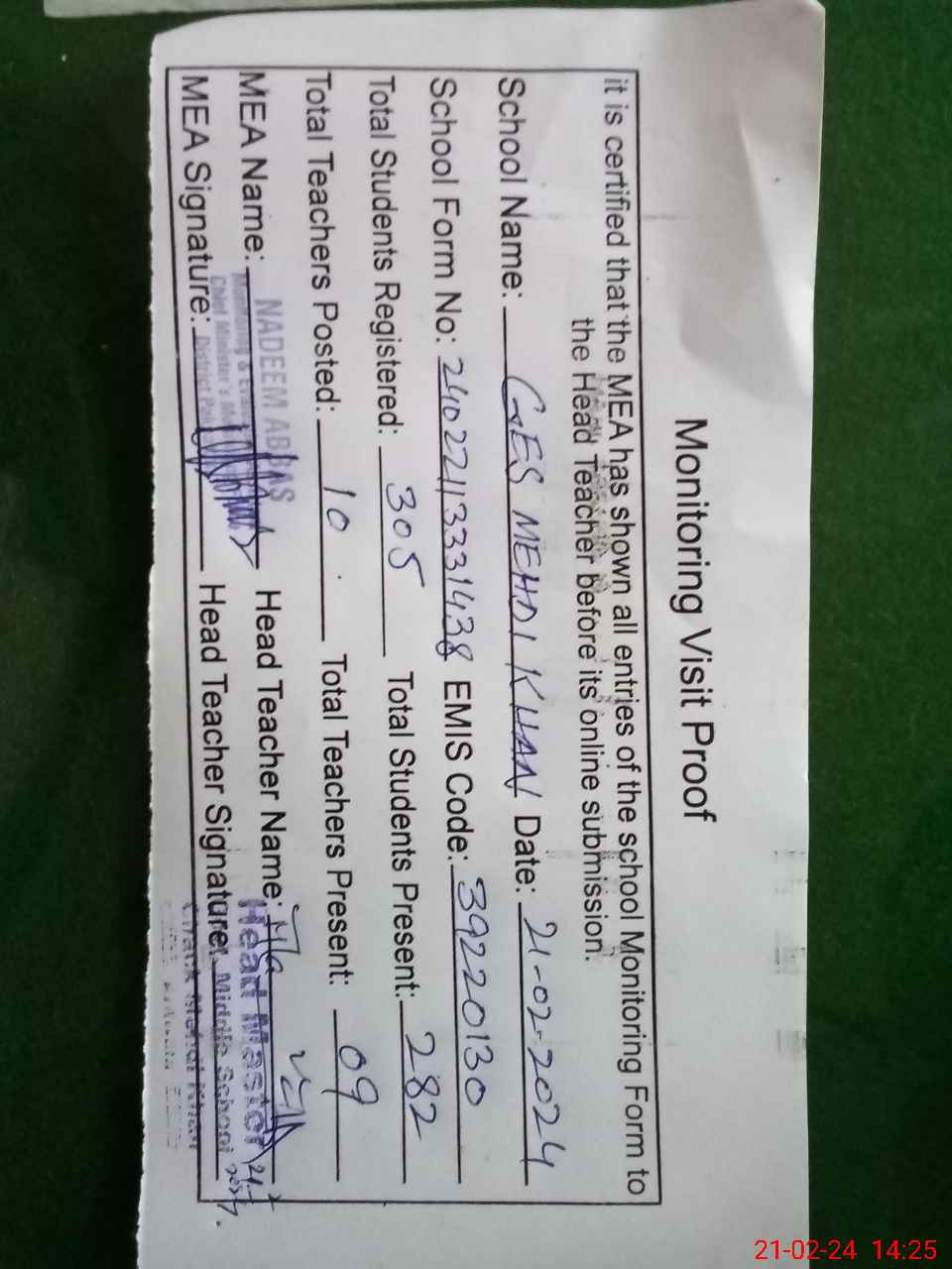 | EMIS Code: 39220130 | Name of School: GES MEHDI KHAN | |||