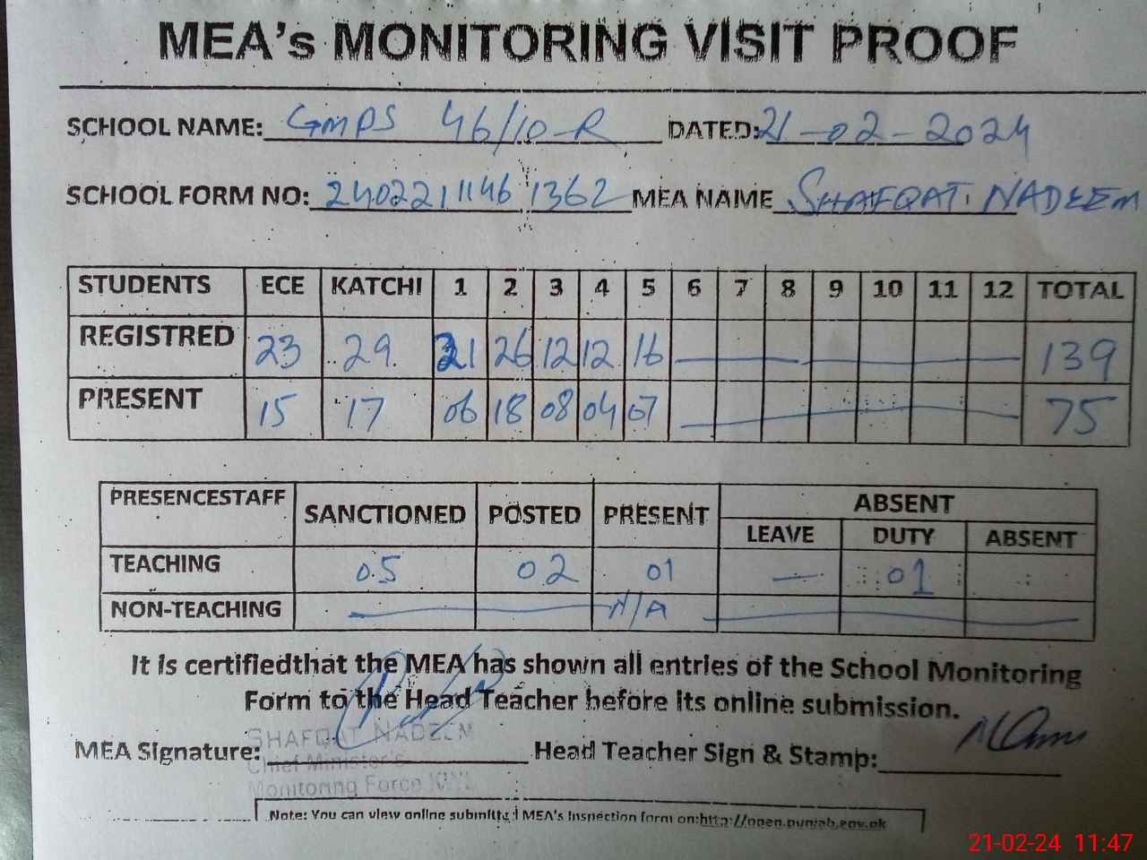 | Attendance Register | Head Teacher | MEA with School | Visit Proof |