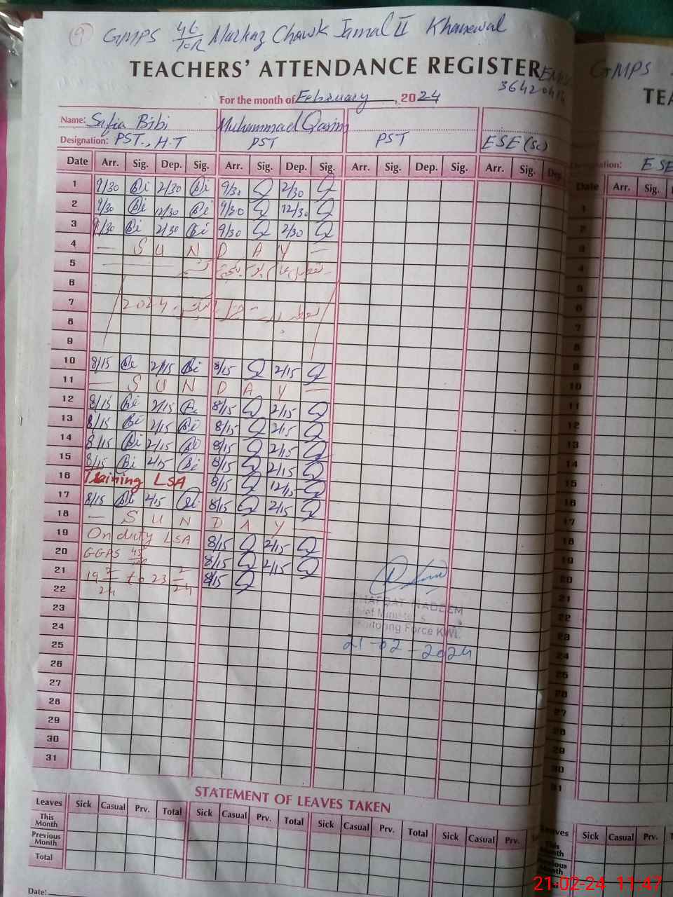 | 36**** | Sa**** Bi**** | PST | Regular | 0 | 0 | 0 | 0 | 0 | 0 | 0 | 0 | 0 | Exam Duty |
