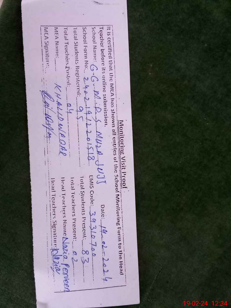 | Certified that this School was Inspected by the Undersigned MEA/DMO Today and the Information Stated Above is as Per Record. | |||||
