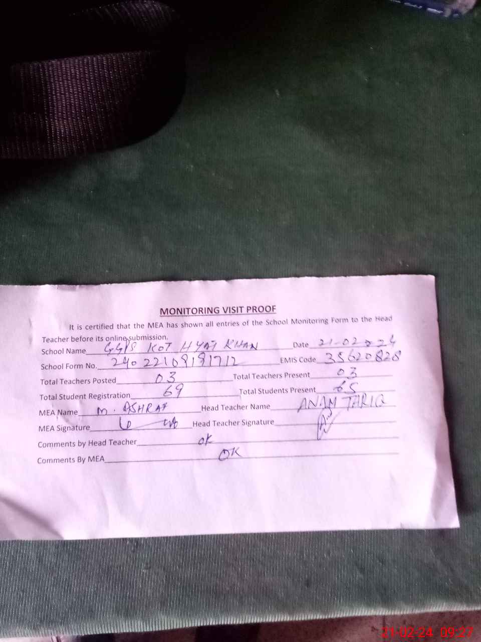 | Attendance Register | Head Teacher | MEA with School | Visit Proof |