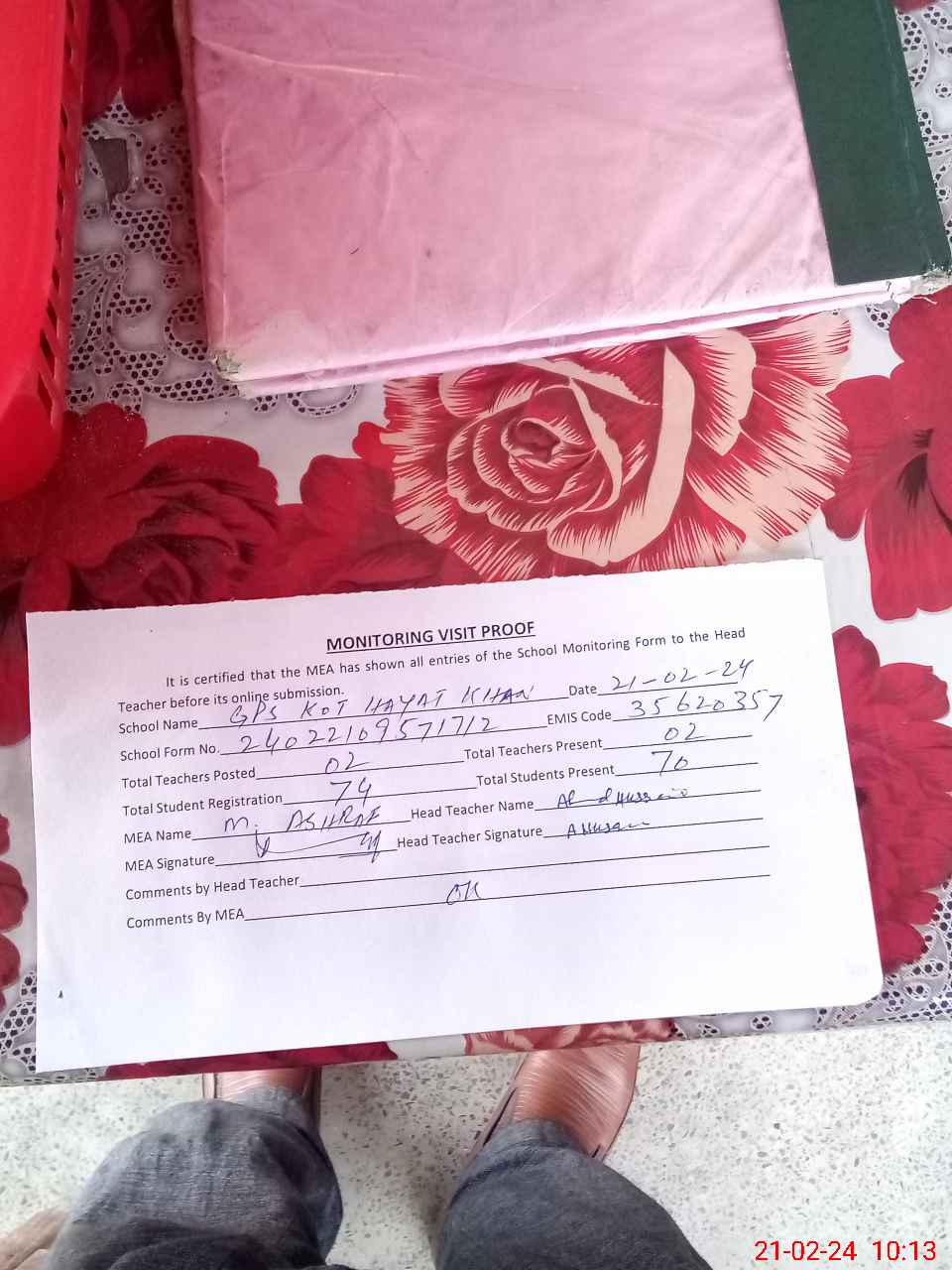 | EMIS Code: 35620357 | Name of School: GPS KOT HAYAT KHAN | |||