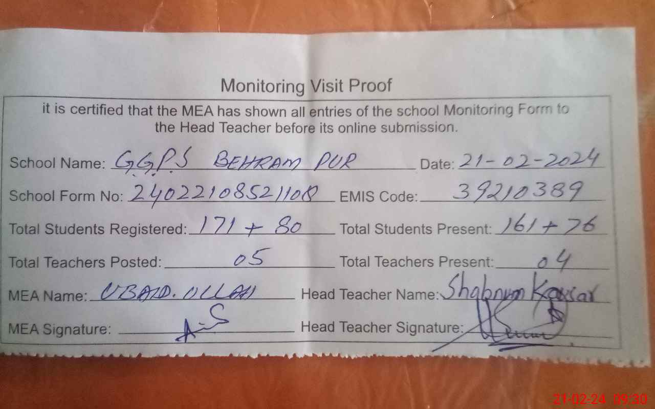 | EMIS Code: 39210389 | Name of School: GGPS BEHRAM PUR | |||
