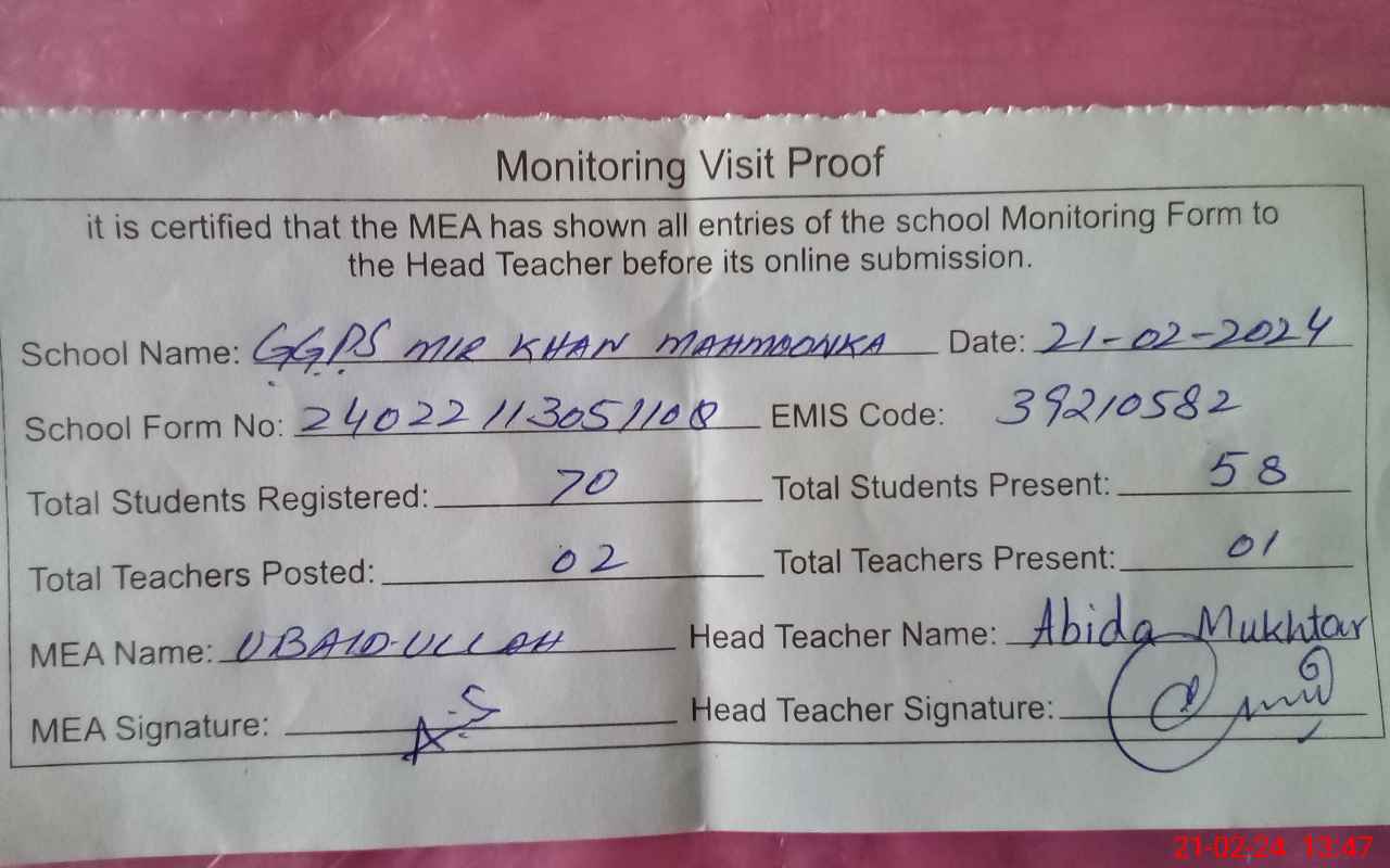 | EMIS Code: 39210582 | Name of School: GGPS MIR KHAN MAHMOONKA | |||